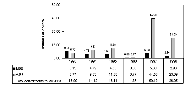 For 1993–1998, MBEs received only $8.13 million in commitments in 1993 and significantly less in all succeeding years. In 1996, they received a mere $1.6 million. Total commitments to MBEs over this six-year period amounted to $26.64 million. Over this period, commitments to WBEs far exceeded that of MBEs, totaling $95.1 million.[8] Every year, except in 1993, WBEs received far greater commitments than MBEs, sometimes as much as 10 times more, as in 1998. The year 1996 was exceptional in that there were hardly any commitments to MBEs or WBEs, reasons for which remain unclear.[9]