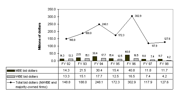 A similar trend was reported for WBEs. Bid dollars to this group rose steadily during 1992 ($13.3 million), 1993 ($15.1 million), and 1994 ($17.7 million), but dropped off during 1995 to $12.5 million. In 1996, WBEs received $16.5 million in bid dollars but saw a decline in 1997 and 1998 from $7.4 million to $4.2 million, respectively. As shown, MBEs received a higher percentage of public works bid dollars than WBEs.