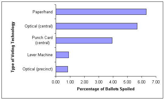 Statistical data appear to bolster these favorable opinions: On average, the spoilage rate for counties using the precinct-based optical scan technology was 0.83 percent far lower than the average spoilage rates for either central-based optical scan technology (5.68 percent) or central-based punch card technology (3.93 percent). Put another way, 22 of the 23 counties with the lowest spoilage rates used precinct-based optical scan technology (the remaining one used lever machines).[43]