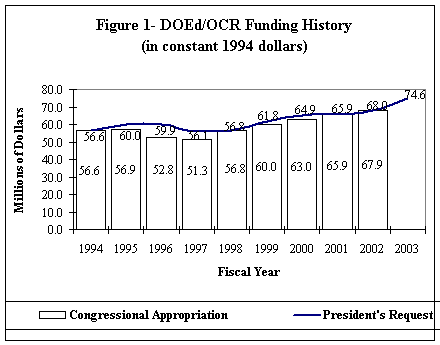 For FY 2003, President Bush is requesting $89.7 million in funding, which is 12.1 percent more than was requested in FY 2002 (see table 1). In real spending power, the President's request would provide only $74.6 million in funding, which represents a 10 percent increase over what was requested in FY 2002 (see figure 1). The President's FY 2003 request is level with the FY 2002 Congressional appropriation. In real spending power, if the President's FY 2003 funding is granted, it will be the largest increase that OCR has received since FY 1998.