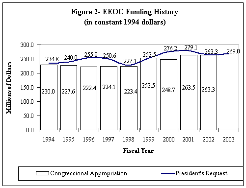 Between FYs 1994 and 2002, Congressional appropriations for EEOC increased by 34.8 percent. After adjusting for inflation, EEOC's budget has increased by only 14.5 percent in the past nine years. Between FYs 1994 and 2003, had Congress met the President's request, EEOC would have received a budget increase of 37.8 percent in actual dollars. But in real spending power, the increase would have been only 14.6 percent.