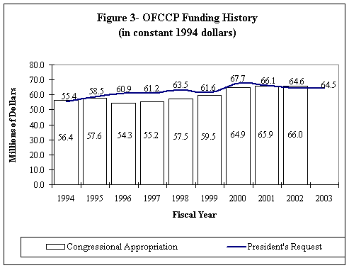 Since FY 1994, OFCCP's budget has increased 37.7 percent. But once inflation is taken into account this increase amounts to only 17 percent. Had the President s requests been met between FYs 1994 and 2003, OFCCP would have received an increase of 39.9 percent, which would have resulted in a 16.4 percent increase after adjusting for inflation.