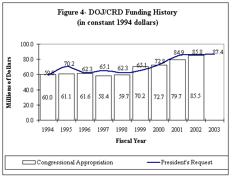 Of the federal agencies reviewed in this report, DOJ/CRD received the largest percentage increase in its budget over the past nine years. Between FYs 1994 and 2002, the Division's budget grew by 67.9 percent. After adjusting for inflation, the budget grew by 42.5 percent. Between FYs 1994 and 2003, even if Congress had approved funding based on the President's request, DOJ/CRD's budget would have grown by 78.1 percent in actual dollars and 48.1 percent in real dollars.