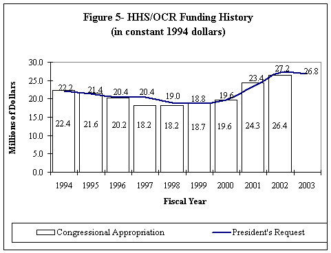 Between FYs 1994 and 2002, Congressional appropriations for HHS/OCR increased by 40.1 percent in actual dollars, although this resulted in only an 18.9 percent increase after adjusting for inflation. Had the President's requests been met between FYs 1994 and 2003, HHS/OCR's budget would have increased by 45.4 percent in actual dollars and 20.7 percent in real dollars.
