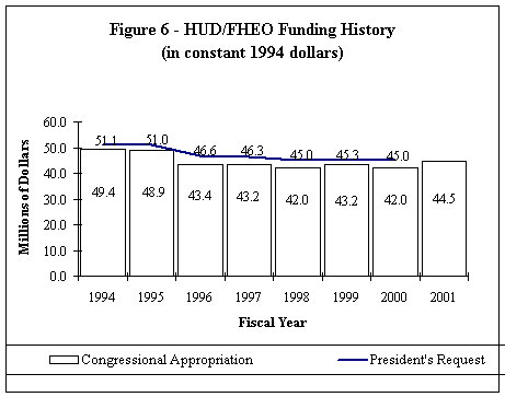 Overall requested funding for FHEO fell in actual dollars between FY 1994 and FY 2000 (see table 11). In terms of real spending power, the amount of funding requested by the President for FHEO decreased 12 percent during this period (see table 12). Between FY 2000 and FY 2001, Congressional appropriations in both actual and real dollars increased by 8.3 percent and 5.9 percent, respectively. In FY 2001, FHEO received $51.4 million in funding (see table 11), but in real terms the amount was much lower, $44.5 million (see table 12 and figure 6).