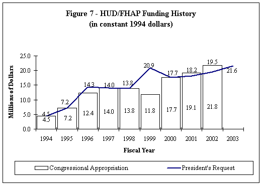 For FY 2003, President Bush has requested $26.0 million for FHAP (see table 13). This amount is significantly higher than the $22.9 million that was requested in FY 2002. In terms of real spending power, if the President s requested is granted, FHAP will receive funding that is level with the FY 2002 Congressional appropriation (see figure 7).