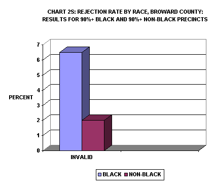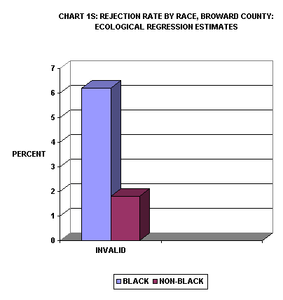 For Broward County, as demonstrated in Table 1S and Chart 1S, the rate of rejection for ballots cast by blacks was an estimated 6.2 percent, compared to an estimated rate of 1.8 percent for votes cast by non-blacks. As demonstrated by Table 1S and Chart 2S, results of extreme case analysis for 90%+ black and non-black precincts confirm the findings of ecological regression analysis for Broward County. In precincts that were 90 percent or more black the overall rate of rejection was 6.5 percent, compared to a rate of 2.0 percent for precincts that were 90 percent or more non-black.