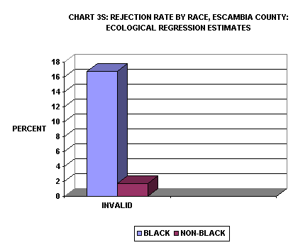 For Escambia County, as demonstrated in Table 1S and Chart 3S, the overall rate of rejection for votes cast by blacks was an estimated 16.8 percent, compared to a rate of 1.7 percent for votes cast by non-blacks. As demonstrated by Table 1S and Chart 4S, results of extreme case analysis for 90%+ black and non-black precincts confirm the findings of ecological regression analysis for Escambia County. In precincts that were 90 percent or more black the overall rate of rejection was 13.7 percent, compared to a rate of 2.2 percent for precincts that were 90 percent or more non-black.